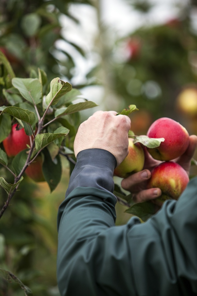 Covered hood in collar with cord. Breathable backside. Press studs on sleeves.